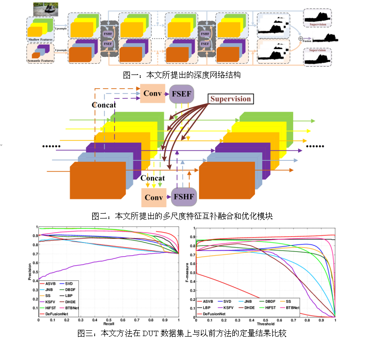 该论文主要目的在于如何利用目前主流的深度学习方法将图像中由于散焦导致的模糊区域检测出来,为后续图像去模糊、基于内容的图像再虚化等编辑提供前期保障。考虑到基于传统手工特征的方法往往错误地将图像中聚焦的非纹理区域检测为模糊区域,本文利用深度学习能够很好地提取图像中物体的高阶语义信息这一优点,很好地解决了这一歧义问题。同时,考虑到人类对图像模糊感知的多尺度因素,本文将深度网络中多层次的特征进行有效地融合,从而提升最终的检测精确度。由于深度网络的浅层特征和深层特征分别关注图像的细节信息和语义信息,我们还将不同层次的特征进行互补融合和递归优化。实验结果表明,我们的方法能达到目前最好的水平。此外,我们还强调所提出的网络结构可以很好地移植到相关的视觉检测任务上去。
