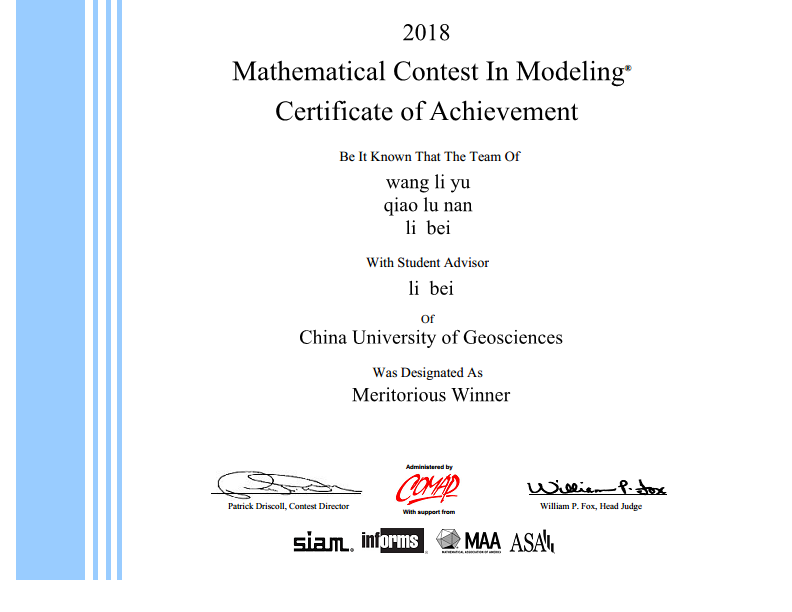 在与众多名校参赛队的激烈角逐中,我校成人色情 三名同学李贝(2016级硕士计算机科学与技术专业)、乔璐楠(2016级硕士计算机科学与技术专业)、王利宇(2017级硕士计算机科学与技术专业)获得了该项赛事一等奖(Meritorious Winner)。另外,成人色情 潘孟琦(2016级硕士计算机科学与技术专业)、数理成人色情 方文倩(2017级硕士信号处理与智能计算)、成人色情 郑雨婷(2017级硕士计算机科学与技术专业)三位同学获该项赛事二等奖(Honorable Mention)。
