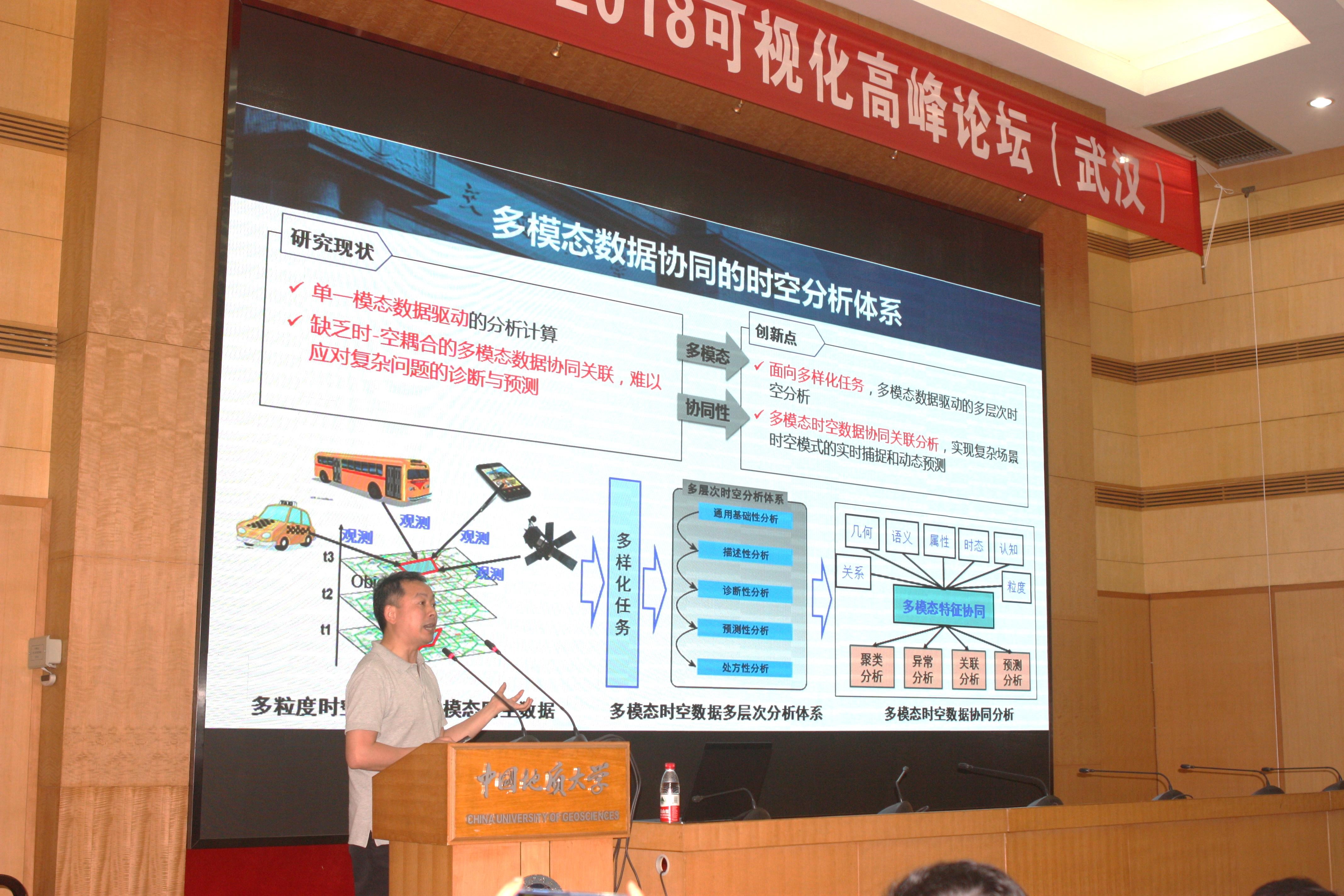 朱庆教授对他在多模态时空大数据可视分析领域的研究进展进行了介绍。他给出了新一代全空间地理信息系统全新定义。他指出,新一代GIS系统的挑战是如何满足人们从低层次的描述性分析,到高层次的解释性分析和预测性分析需求,难点在于面向多样化多层次的任务需求,如何从不同来源、不同粒度、不同模态的海量高维动态的时空大数据中整合彼此增益信息进行有效的数据融合,实现关联分析及分类预测,需要突破GIS已有数据驱动的图形分析与统计分析局限,发展数据-模型-交互协同驱动的全空间增强现实新模型新方法。