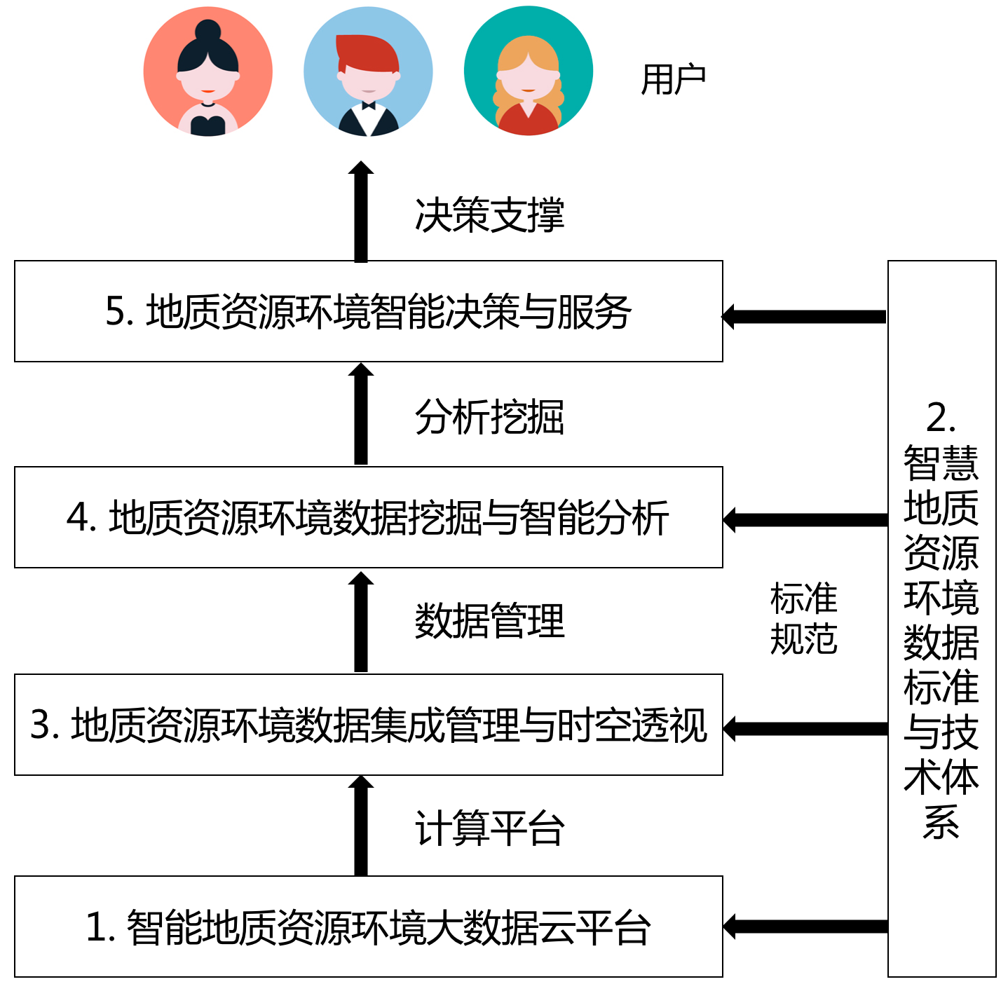主要建设内容包括:构建并发展智慧地质资源环境大数据云平台,是实现海量、多源、异构的地质资源环境数据高效管理与智能应用的有效保障。构建并发展智慧地质资源环境数据标准与技术体系,是实现地质资源、地质环境大数据集成、共享与产业化处理的关键环节。构建并发展地质资源环境数据集成管理与时空透视技术平台,研发地质资源环境数据集成管理与时空透视技术与软件系统、地质资源环境数据挖掘与智能分析技术与软件系统、地质资源环境智能决策与服务及软件系统。发展地质资源环境挖掘与智能分析存在理论与方法的研究。开发基于地质资源环境大数据的智能决策技术,形成产业,研发大数据智能决策支持系统,实现地质资源环境大数据的智能分析、科学决策与泛在网络下的智能信息服务。