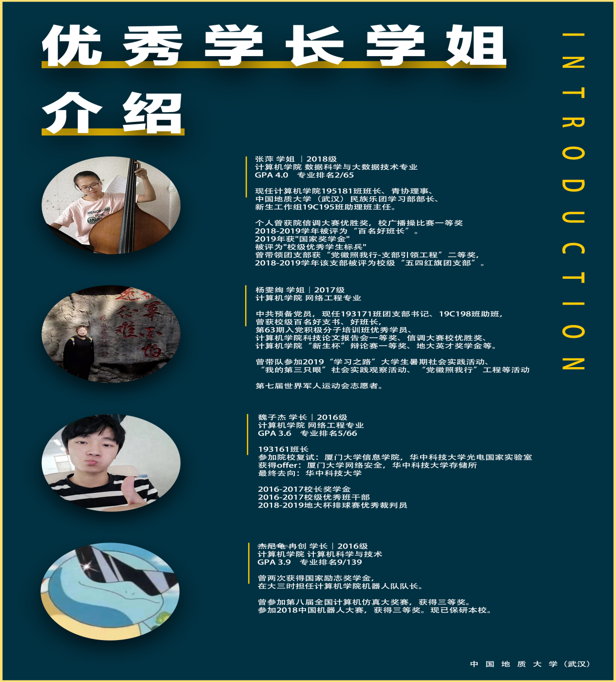 接下来是16级网络工程专业魏子杰学长,魏子杰学长学分绩点为3.6,专业排名第五,担任193161班班长,参加了厦门大学信息成人色情 和华中科技大学光电国家实验室的复试,并获得了进入厦门大学网络安全和华中科技大学存储所的保研资格,最终保研华科;他2016-2017学年获得校长奖学金,“校级优秀班干部称号”,2018-2019学年被评为“地大杯”排球赛优秀裁判员。