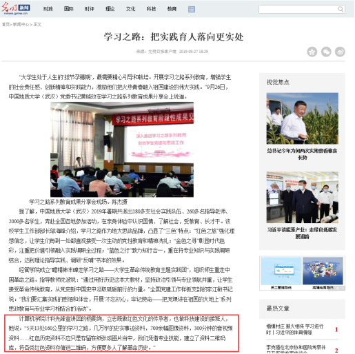 2019年,计科先锋宣讲团前往湖北省黄冈市红安县,通过实地走访、人物访谈、史籍资料收集等方式回顾红安县革命战争历史,接受革命传统成人色情-华人色情-国外色情 。实践团走进董必武故居,拜访董老后人;前往湖北红安干部成人色情 ,提升党性修养;对接红安县档案馆,依托专业知识建立红色资料库;回校后开展系列宣讲,激发爱党热情。5天13处160公里的学习之路,1万余字的史实事迹资料,700余幅图像资料,300分钟的音视频资料,让团队成员切实感受到“朴实勇毅不胜不休”的红安精神,立志做红色文化的传承者,做科技建设的接班人。