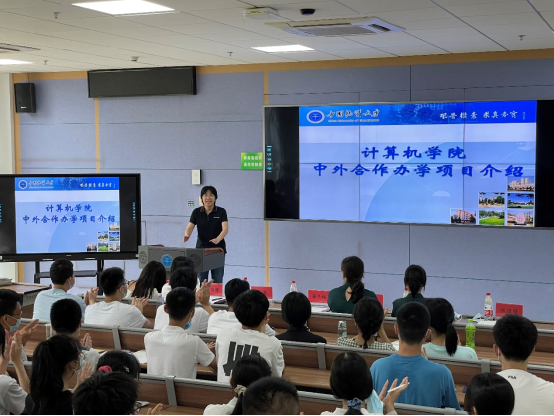 张冬梅做项目介绍,她从基本情况、师资队伍、招生情况、课程情况等方面向同学们介绍了项目的整体情况,并希望同学们在校期间培养专业素养和实践能力、提升英语水平,努力成长为德智体美劳全面发展的国际化人才。
