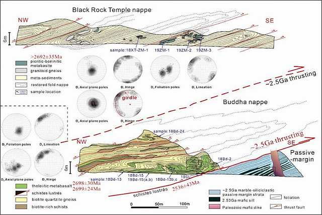 我国华北邢台地区出露的这套太古宙-阿尔卑斯型近水平褶皱/逆冲推覆体中保留了苦橄岩-玻安岩和岛弧拉斑玄武岩,不仅前者逆冲于后者之上,而且两者依次作为外来岩体就位于太古宙被动大陆边缘的沉积序列上。苦橄岩-玻安岩和岛弧拉斑玄武岩的年龄为俯冲起始提供年龄下限,推覆体在2520百万年前就位于被动大陆边缘,标志板块的汇聚-碰撞和俯冲结束。这一结果表明早期地球俯冲带和洋壳的生命周期可达1.78亿年,若以2厘米/年的板块运动保守速率估算,将有至少3560公里的洋壳横向往俯冲带输送并俯冲消亡,这一认识为太古宙存在板块构造提供了最直接和正面的证据。