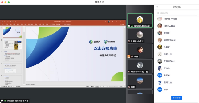 接着,深信服科技华中区安全服务工程师孙朝明为同学们带来网络安全攻防技术讲座《攻击方那点事》,讲座在线人数保持在90人左右,最高超过100人。通过介绍网络攻击的基础知识和实战案例,揭秘“网络黑客”,帮助学生提高网络安全意识,提高网络安全防护能力。
