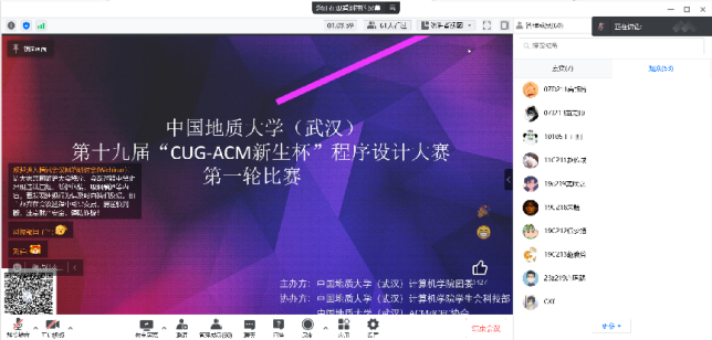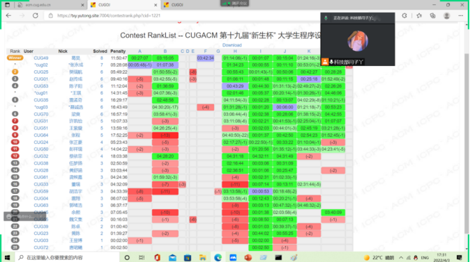 为配合疫情防控工作,避免人员聚集,决赛采用线上线下结合的方式开展。沈晨介绍比赛基本情况,寄语学生比出风格赛出水平;赵霄代表裁判组宣誓,严守准则公平公正。12:30比赛正式开始,在持续5个小时的比赛中,腾讯会议实时更新比赛排名,选手们全神贯注争分夺秒,比赛现场紧张刺激竞争激烈。赛后何永鑫为大家讲解比赛题目。