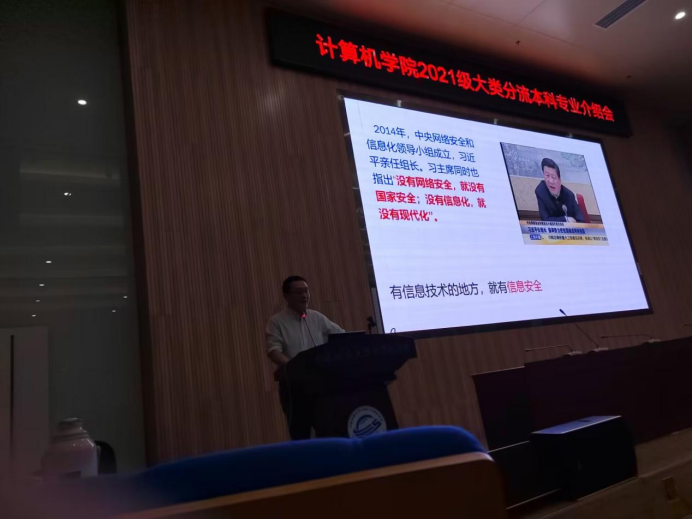 为让学生充分了解分流专业情况,做好成人色情 2021级本科生专业分流工作,11月10日下午,“成人色情 2021级大类分流本科专业介绍会议”于成人色情 一楼126报告厅成功举行,会议于腾讯会议平台线上同步进行并全程录播。成人色情 本科教学副院长陈云亮、计算机科学与技术系教学主任梁庆中、信息安全系主任程池、计算机应用系主任张夏林、大数据系教学主任王媛妮、人工智能系主任唐厂、2021级辅导员谭文博、本科教学秘书李婷及2021级计算机类本科生参与了本次会议。