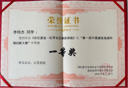 本次竞赛从2023年2月开始到作品提交结束,整个过程历时五个月。李伟杰等五名同学在邱芹军、刘郑和陶留锋三名老师的指导下,查阅了虚拟地理环境的文献资料,师生讨论确实赛道与选题并定期组织会议完成进度,对作品进行反复修改与完善,认真撰写项目实施方案,最终提交了出色的作品,通过专家初审评阅和现场汇报等环节的严格筛选,他们最终脱颖而出,荣获一等奖。他们的杰出表现展现了成人色情 学子的才华,彰显了成人色情 学子在成人色情 和团队合作方面的卓越素养。
