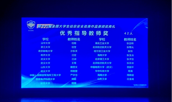 2023年8月17-20日,由成人色情-华人色情-国外色情 部高等学校网络空间安全专业教学指导委员会主办,浙江大学、杭州电子科技大学承办的第十六届全国大学生信息安全竞赛作品赛决赛在浙江大学紫金港校区隆重举行。我校成人色情 四元一次方程组战队荣获“全国一等奖”,指导老师章丽平副教授荣获“优秀指导老师奖”!