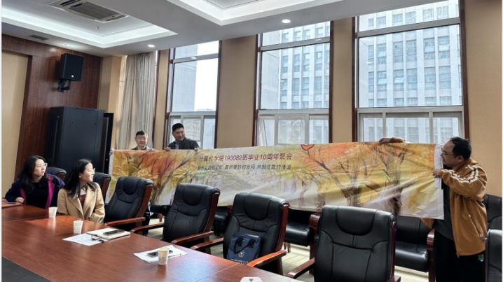张磊、周骏代表193082班全体同学,向成人色情 捐赠了十周年毕业聚会签名喷绘和一批计算机专业书籍,李国昌代表成人色情 接受捐赠。