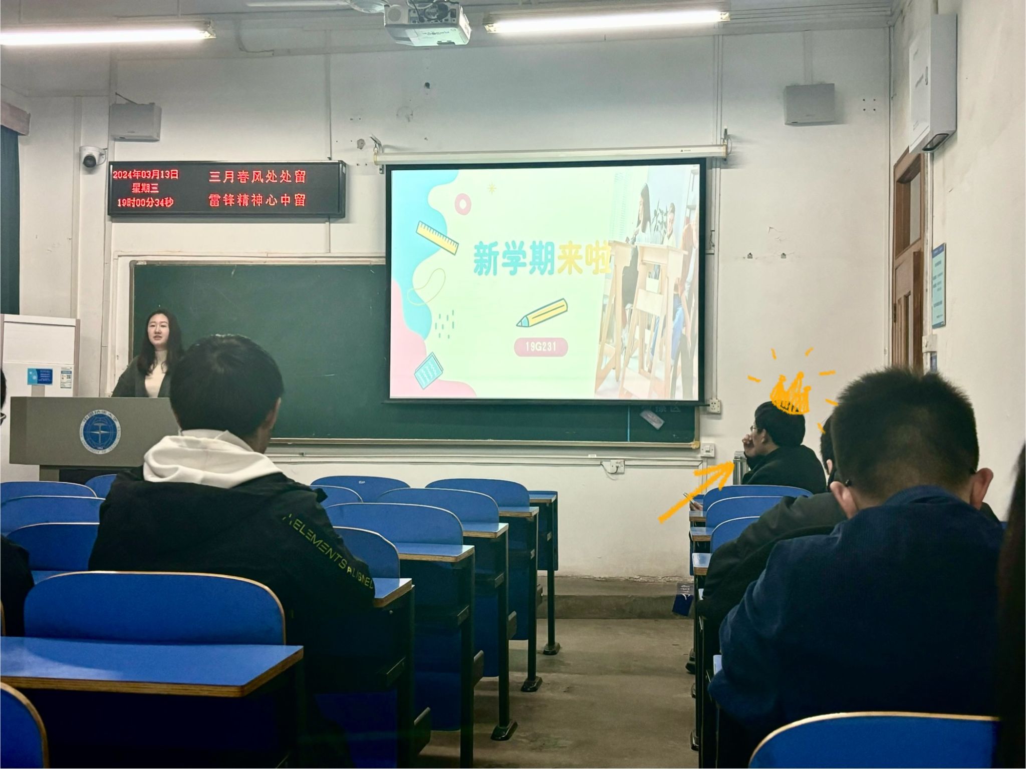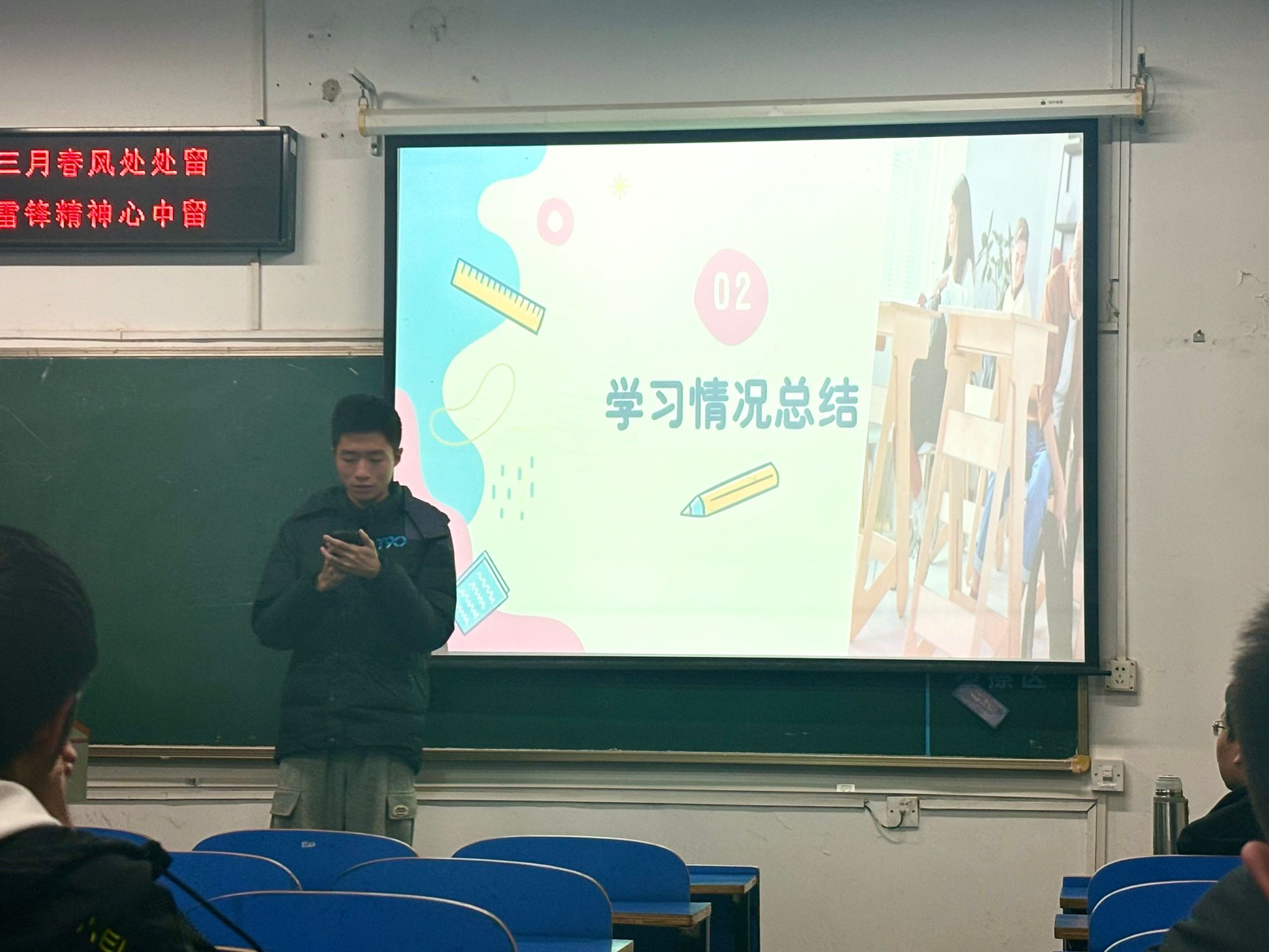随后各班学委向同学们作学情分析报告。学委从班级整体绩点情况、优秀率、挂科率入手,肯定了同学们在上一学期的生活学习中取得的成绩,同时指出部分同学仍存在不足之处,勉励取得优秀成绩的同学不自傲,接续努力,在新学期里再创佳绩,鼓励成绩不够理想的同学不要气馁,在新学期更加专注于学习,实现自我的突破。此外,学委在分析上学期挂科科目情况后,提醒同学们要格外注意高数和线上课程的学习。