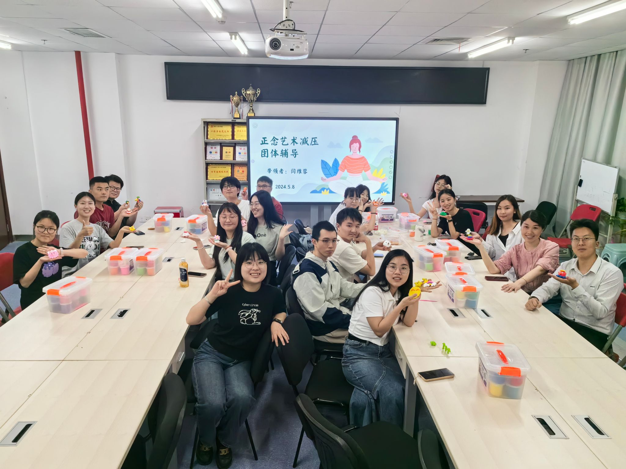 在这个环节中,闫维蓉老师首先讲解了粘土的制作工艺及减压功能,帮助同学们深入了解粘土艺术的情感表达和创造潜力。同时,闫老师引导同学们用正念的方式感受超轻粘土的质地、色彩、形状变化的感觉,专注于粘土的手工制作,感悟正念觉察魅力,体验心灵的细致探索。同学们根据自己的情感和心境,用五彩缤纷、形状各异的手工作品展现出内心深处的自己。同学们完成作品后还踊跃分享了自己作品的创作灵感以及心得体会,进一步激发了他们内心的探索欲望和自我认知。最后,闫老师还分享了更多放松减压的方法,鼓励同学们在面对压力时寻找快乐之道,以促进更高效的学习、工作和生活。许多同学表示这次超轻粘土减压活动帮助他们暂时放下烦恼,全身心地投入到手工创作中,有效释放了内心的压力与负面情绪,是非常不错的一次体验,希望能增加举办类似活动的频率。