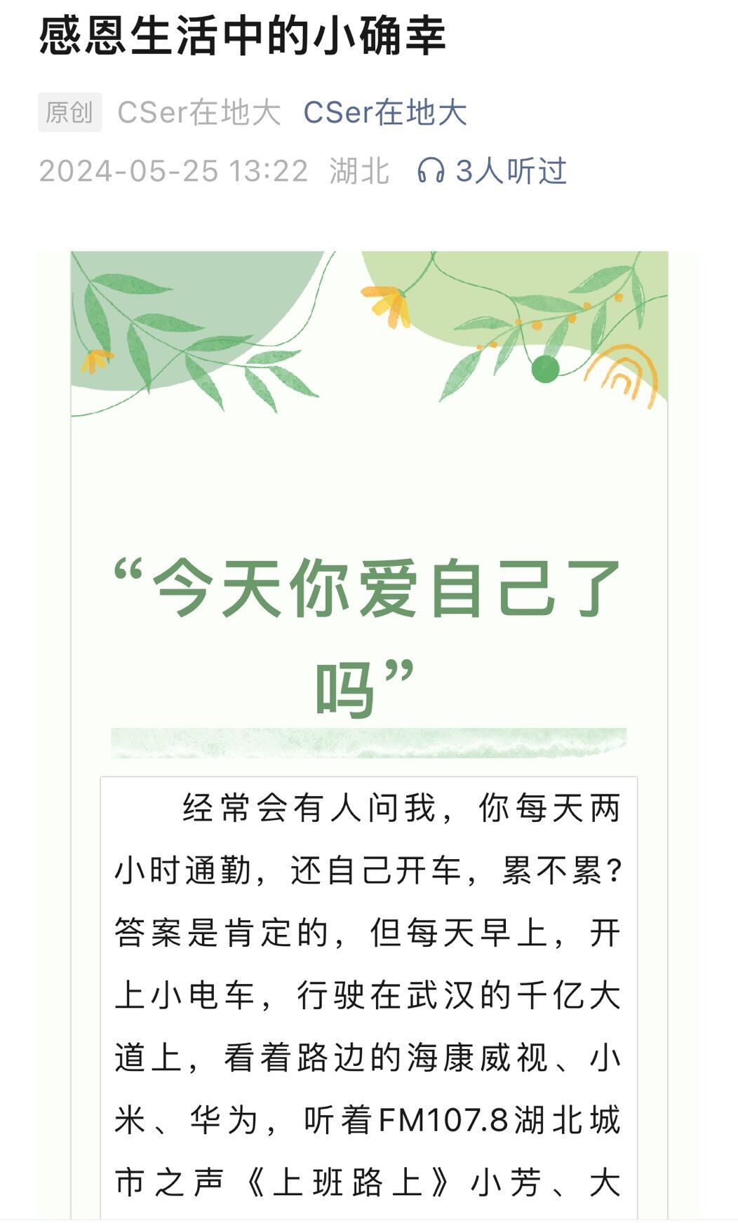 5·25全国大学生心理健康日当天,成人色情 官方公众号“CSer在地大”发布了《感恩生活中的小确幸》,学工组全体老师为同学们送上祝福与期许,鼓励大家在生活中发现爱、感受爱、传递爱,学会享受生活中的小确幸,也祝愿CSer能在成人色情 感受到更多细碎而确切的幸福。