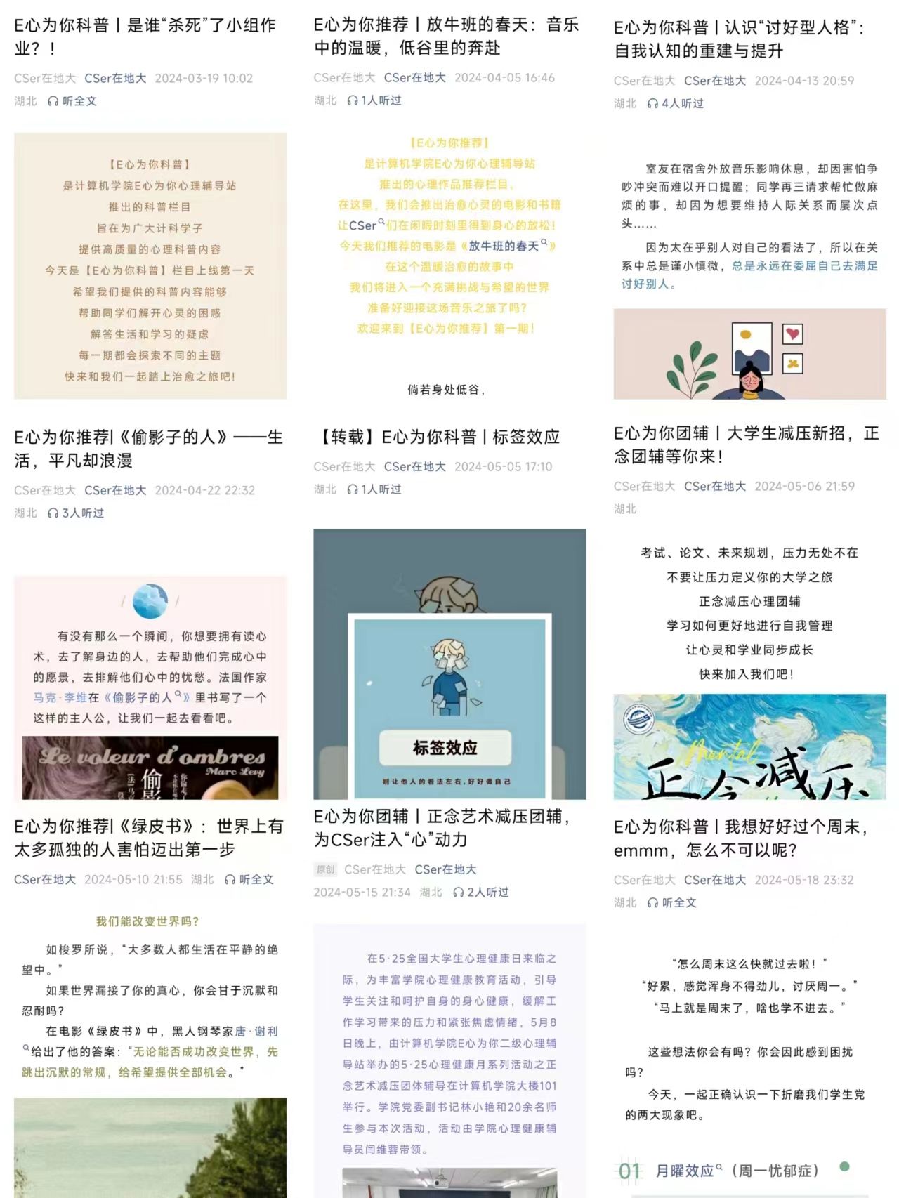 本学期在成人色情 官方公众号“CSer在地大”开设了“E心为你”栏目,发布“E心为你科普”、“E心为你推荐”、“E心为你团辅”九篇专业推文,涵盖了心理健康知识科普、电影书籍推荐和心理团辅等方面,吸引了大量同学关注和阅读。通过线上宣传,有效扩大了心理健康月活动的影响力和覆盖面,促进了良好的成人色情 氛围。