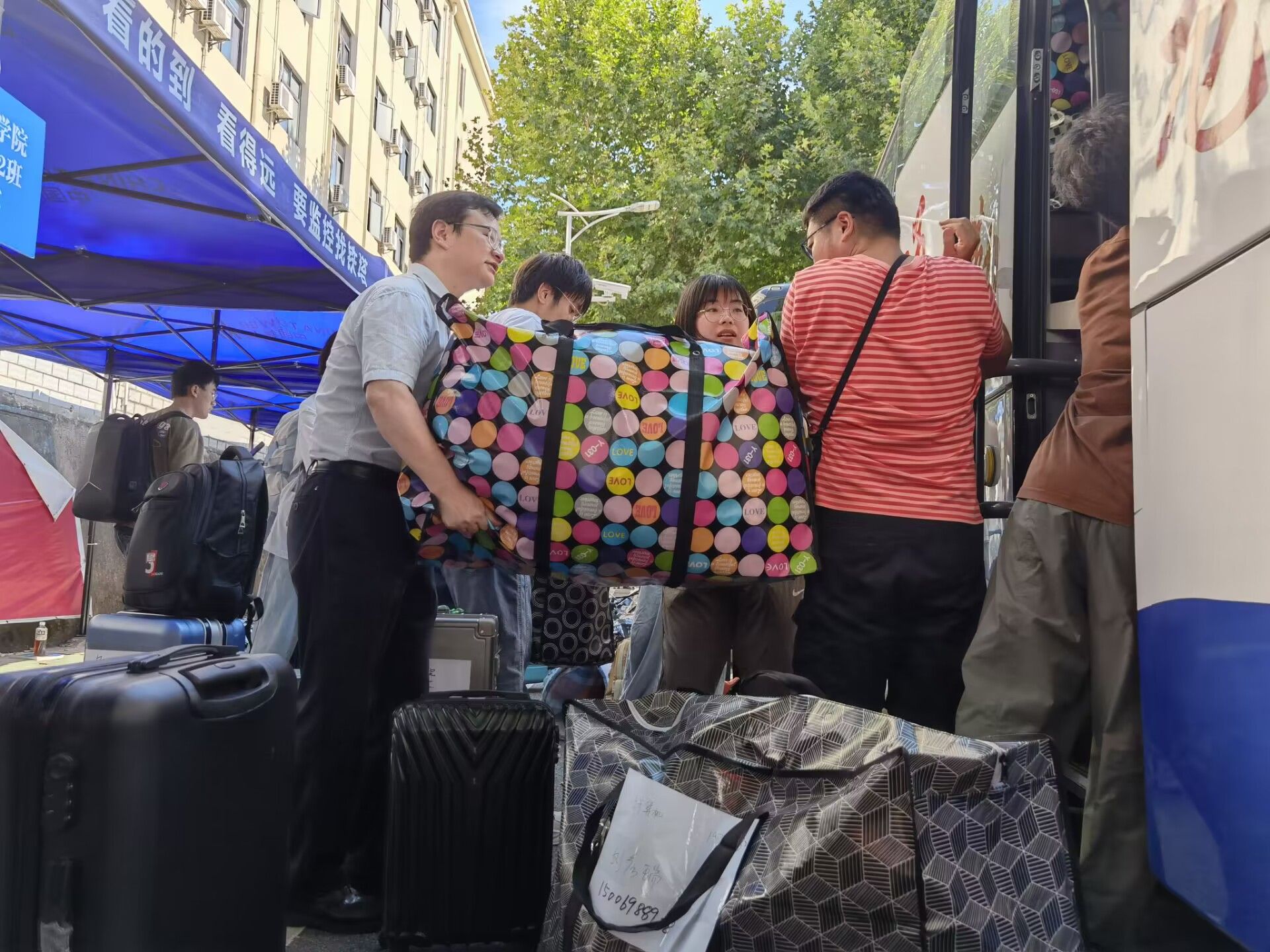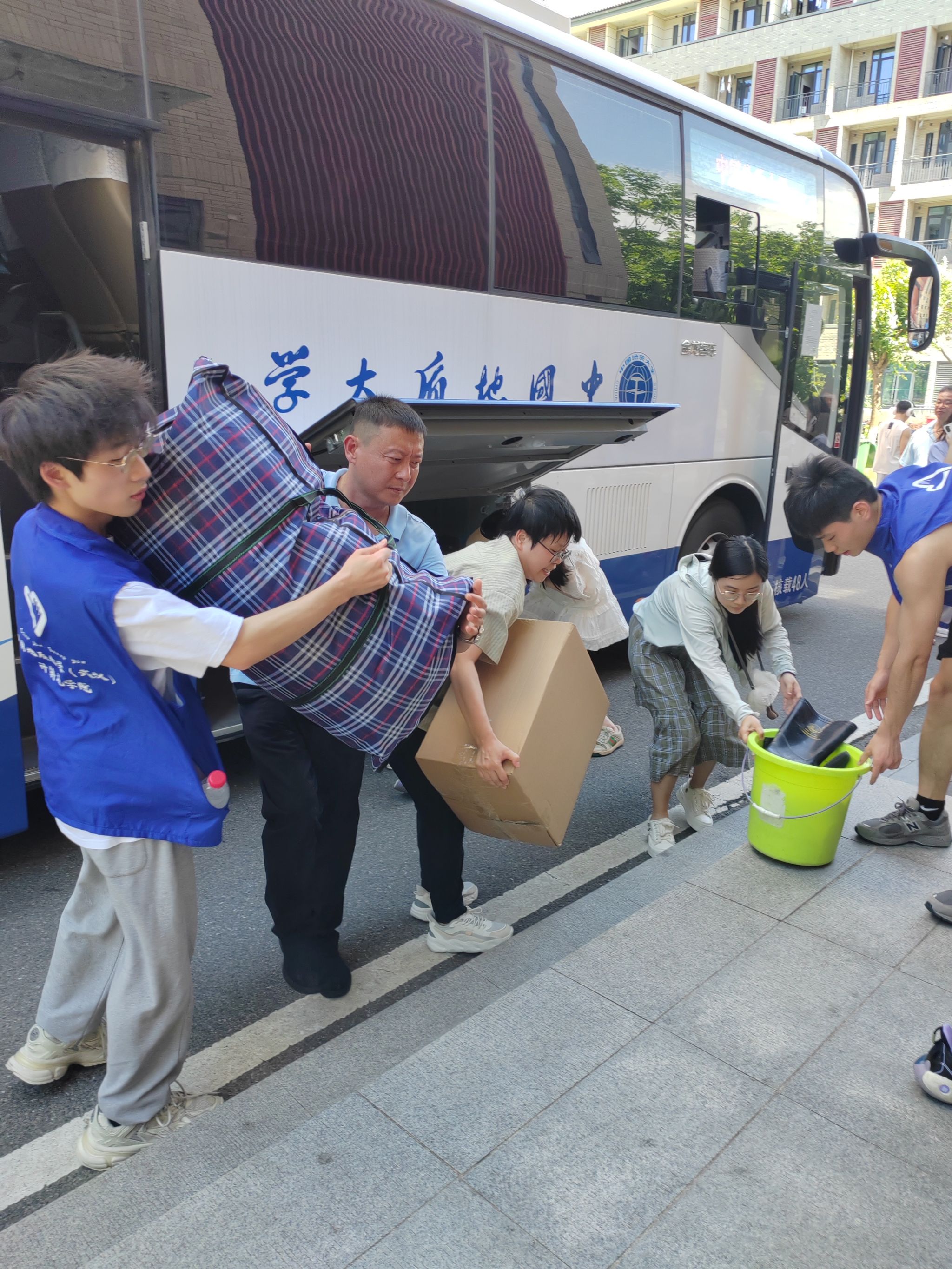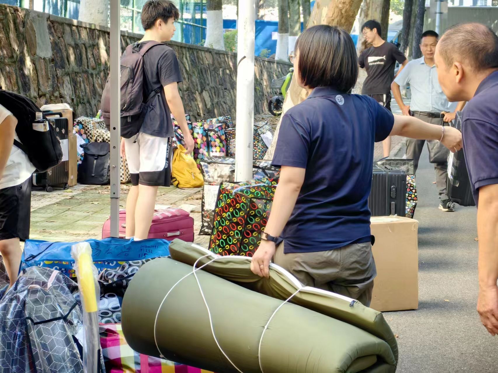 大巴驶入校园,在学生们即将入住的宿舍前,橙色的凉棚早早张开,身着蓝色马甲的志愿者们等候多时。多批运输车辆将学生物品运至宿舍楼下,老师和志愿者为新到来的2023级计科学子搬运行李,指明方向;宿管阿姨分发钥匙,严谨细致地录入信息;同学们彼此合作,将沉重的包裹运到新宿舍,开启一段崭新的未来旅程。