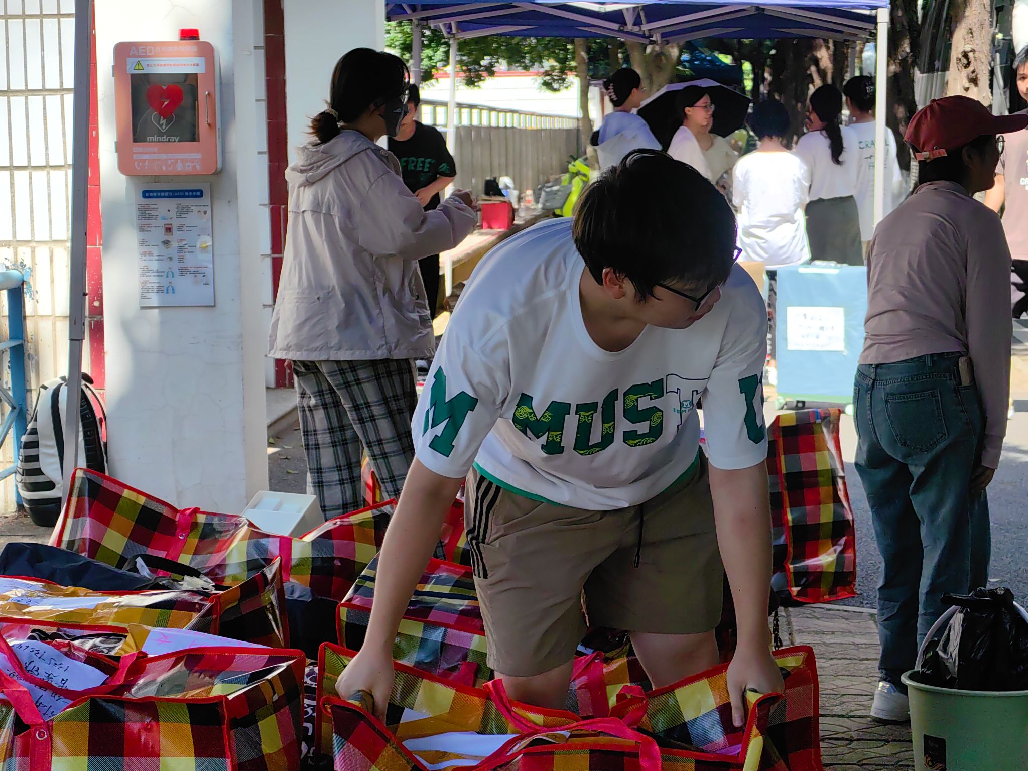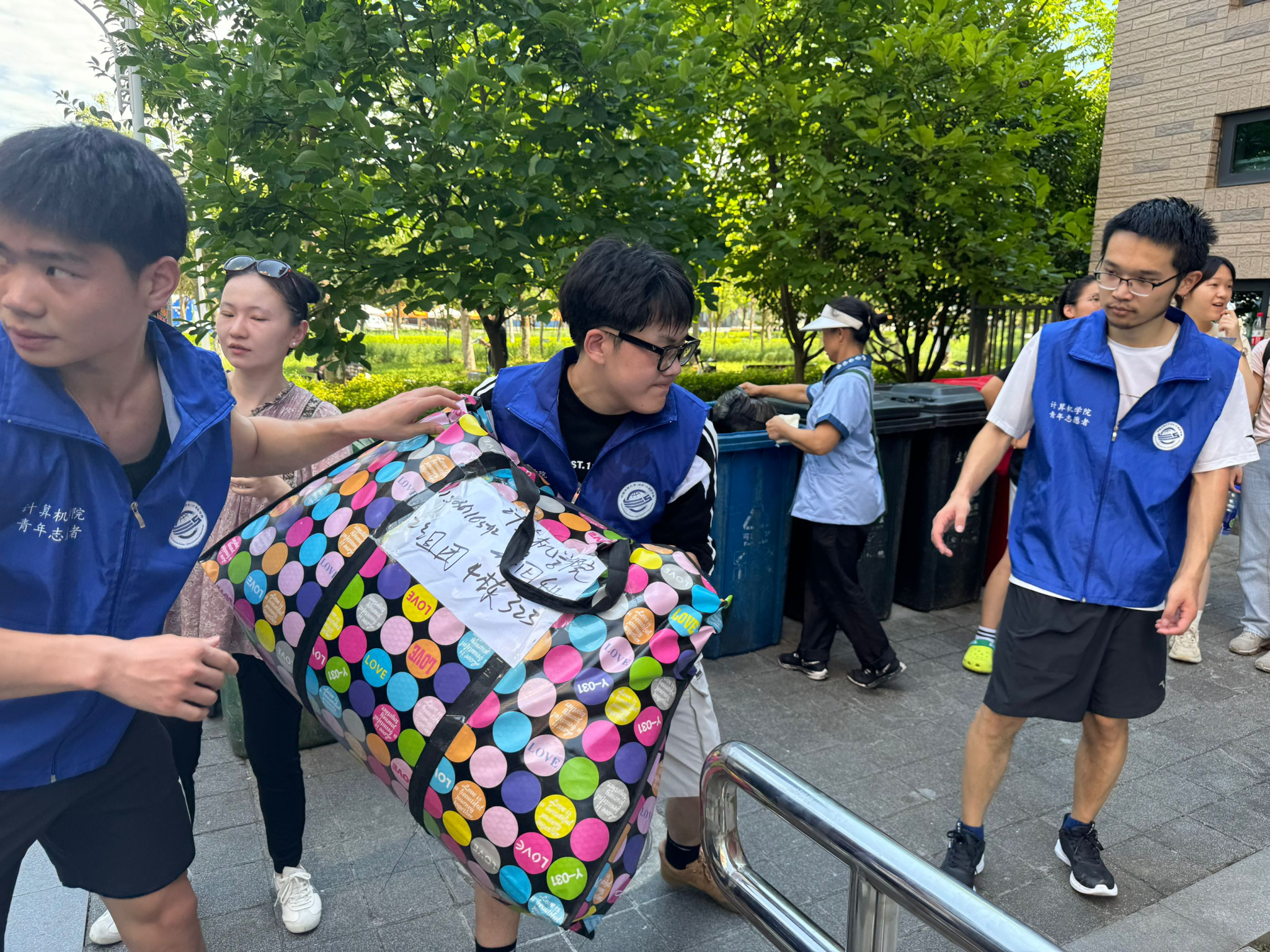 同学们早已打包好行李在楼下等待,随着搬运车辆逐次停下,大家自觉组成流水线相互接力,一件件纸箱、行李箱、储物袋最终被罗列得整整齐齐。尽管天气炎热,但大家的热情不减,许多男生主动帮助女生搬运行李,在各位老师的指挥下,一切都在有条不紊地进行。