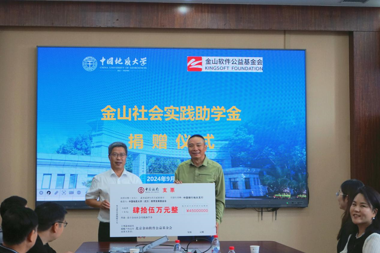 在播放完学校宣传片后,王华副校长致辞。他对王全国副理事长一行的到来表示热烈欢迎,重点介绍了学校办学特色和发展成绩,感谢金山软件公益基金会在我校设立“金山社会实践助学金”、关爱地大学子,希望双方进一步加强沟通、深化合作,共同为社会培养优秀人才。