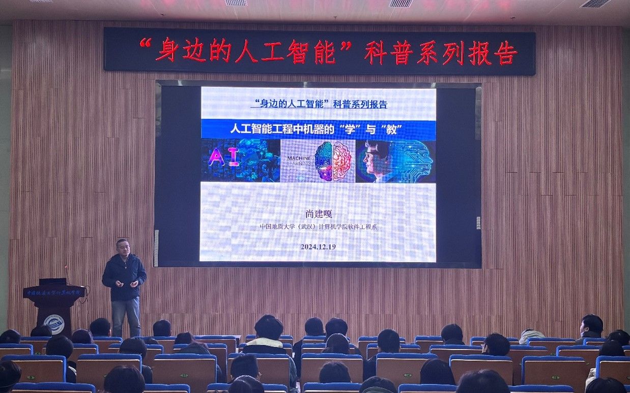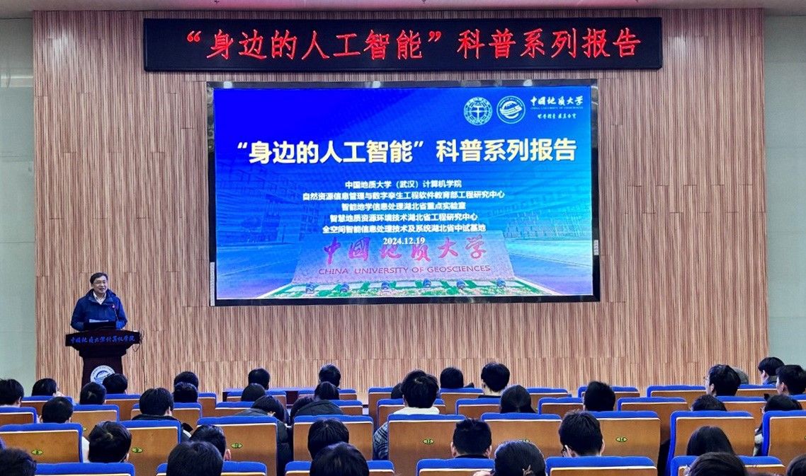 习近平总书记指出:“科技创新、科学普及是实现创新发展的两翼,要把科学普及放在与科技创新同等重要的位置”。为促进成人色情 科学技术普及工作,弘扬科学精神,激发创新活力,12月19日下午,成人色情 举办的“身边的人工智能”科普系列报告活动在计科楼126报告厅进行,邀请了武汉大学测绘遥感与信息工程国家重点实验室武辰教授、成人色情 数据科学与大数据系李程俊副教授、计算机应用系陈麒玉教授、智能科学与技术系黄绍广教授、软件工程系尚建嘎教授、信息安全系朱静副教授、计算机科学与技术系甄慧翔副教授作专题科普报告,成人色情 副院长刘刚主持活动。报告会得到了自然资源信息管理与数字孪生工程软件成人色情-华人色情-国外色情 部工程研究中心、智能地学信息处理湖北省重点实验室、智慧地质资源环境技术湖北省工程研究中心、全空间智能信息处理技术及系统湖北省中试基地等成人色情 平台的支持,也是成人色情 建设的武汉市科普基地的活动之一。200余名师生参加了本次活动。