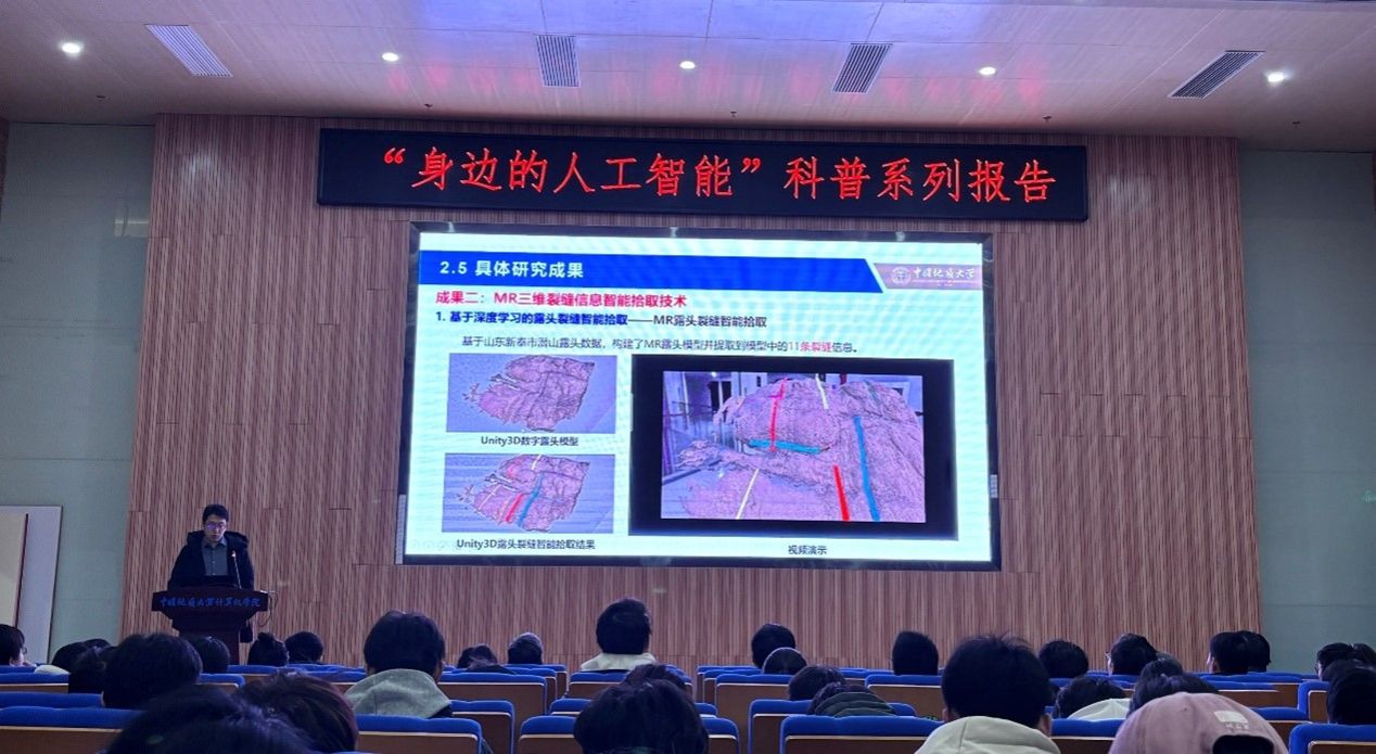 陈麒玉教授报告题目是“MR探索储层裂缝系统”。MR混合现实是让真实物体和虚拟物体实时共存并互动的技术,已经在游戏娱乐、成人色情-华人色情-国外色情 培训、能源矿藏等多个领域展现出其独特的应用价值。陈老师向同学们介绍了基于MR的储层裂缝系统表征案例,并用视频演示了MR三维裂缝信息智能拾取、MR三维缝网智能表征等技术。陈教授团队还准备了沉浸式MR头显设备,可供现场师生互动体验。