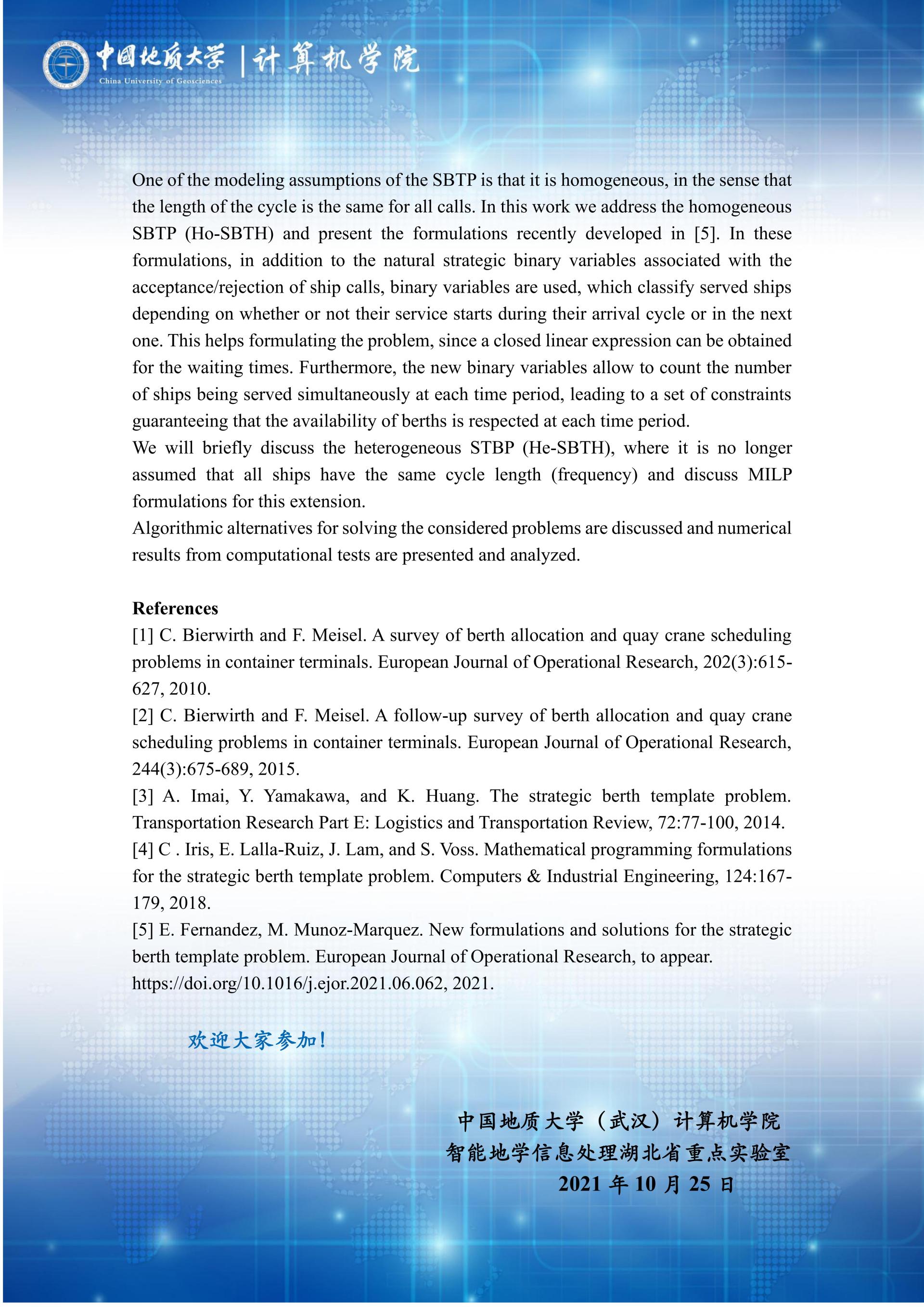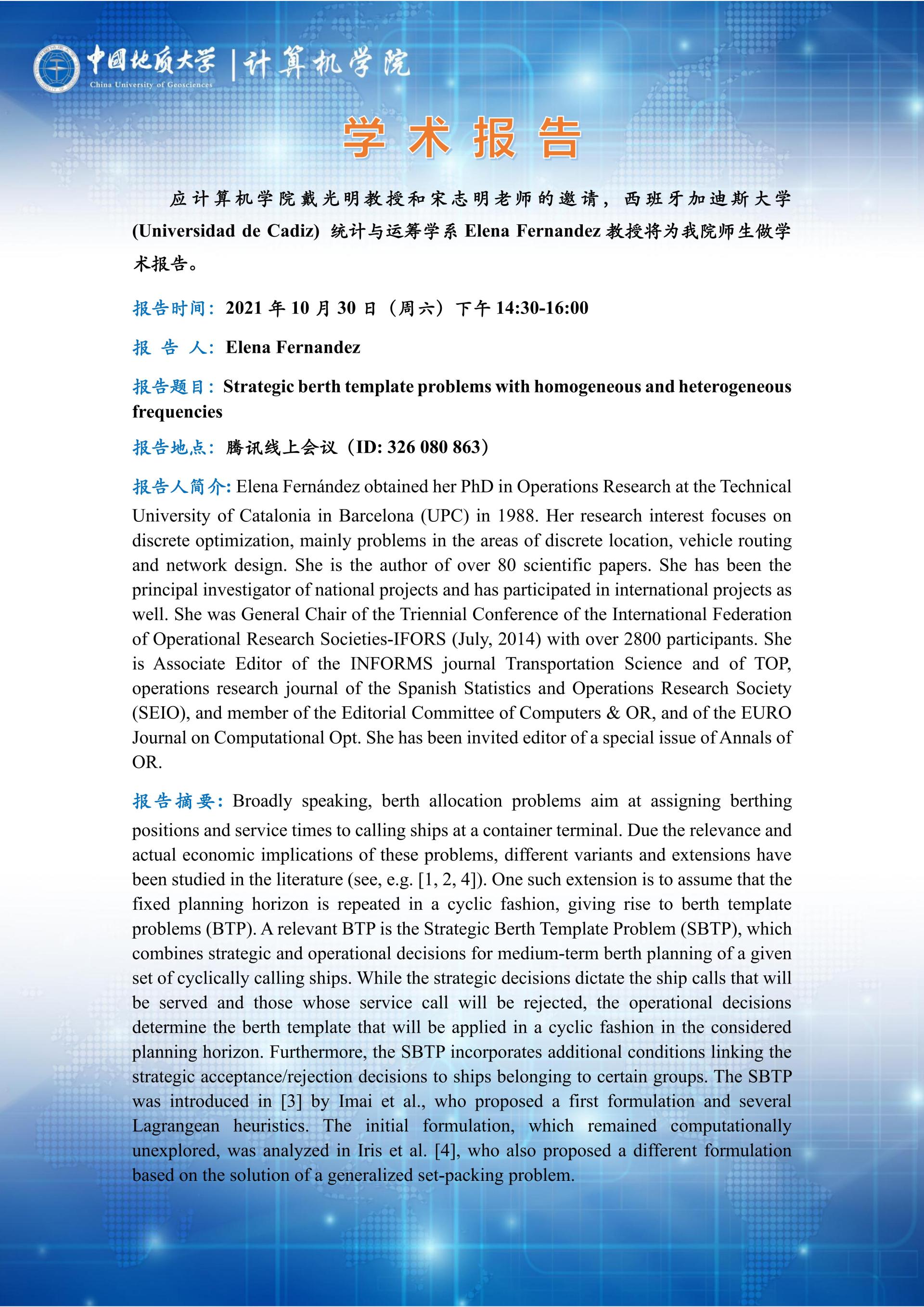 成人色情 报告——西班牙加迪斯大学Elena Fernandez:Strategic berth template problems with homogeneous and heterogeneous frequencies