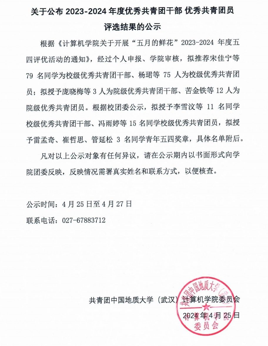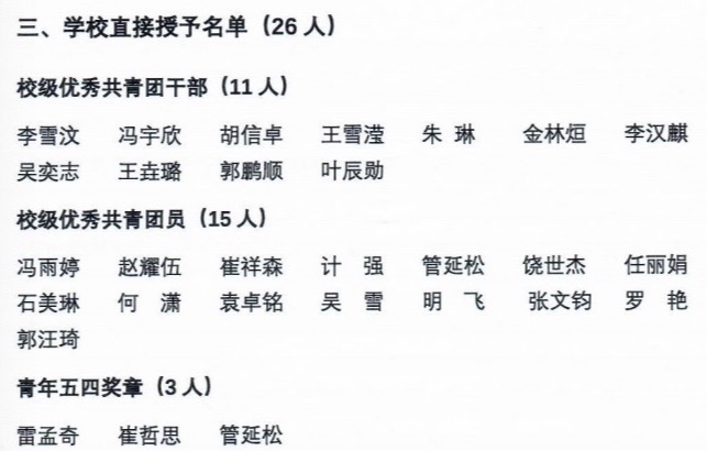 4. 获得 2023-2024 年度五四红旗团支部的支部书记或副书记(班长)直接认定为优秀共青团员或优秀共青团干部的名单由校团委组织部报送。