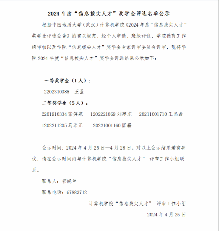 2024年度“信息拔尖人才”奖学金评选名单公示