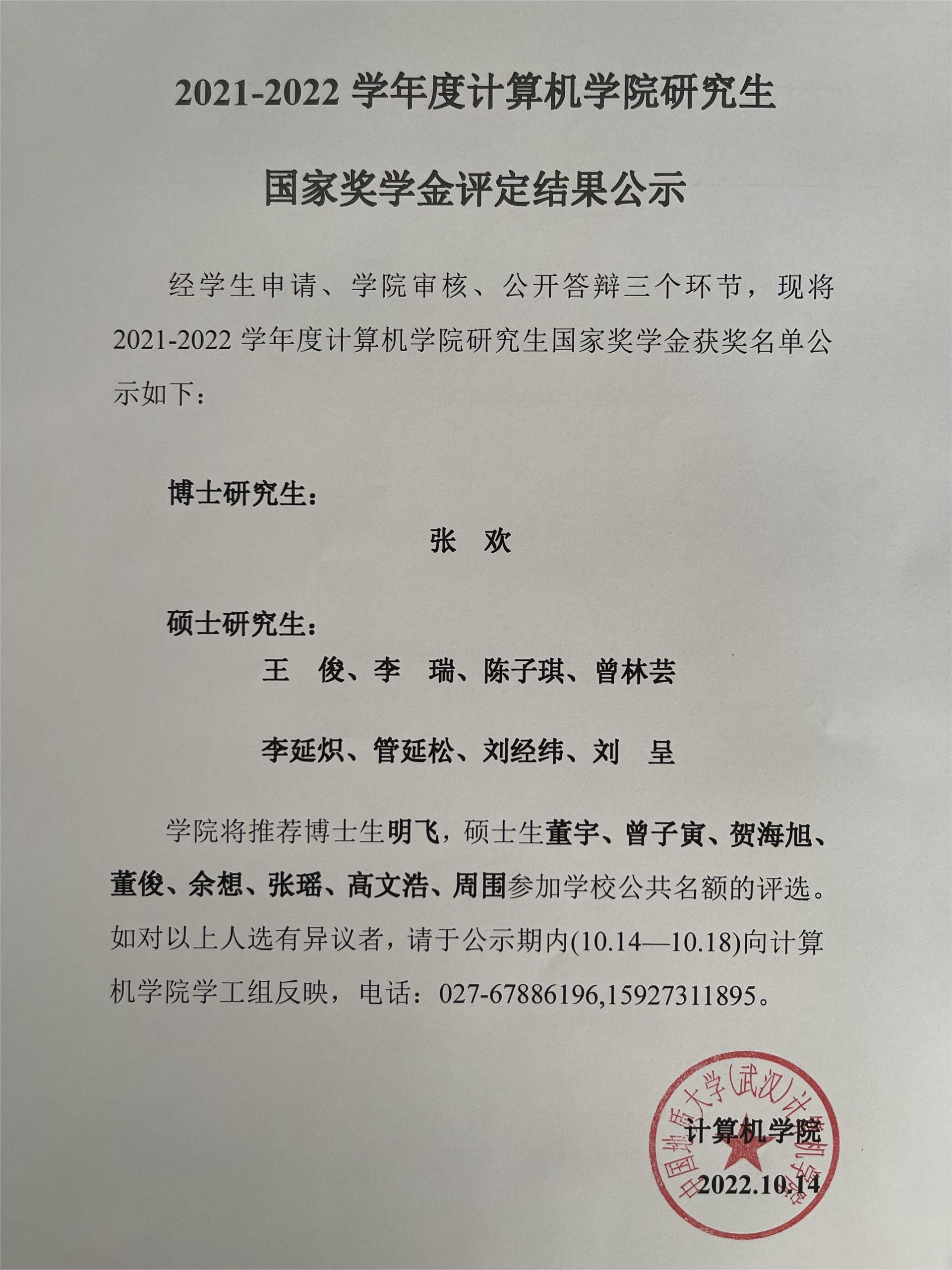 2021-2022学年度成人色情 成人色情 国家奖学金评定结果公示