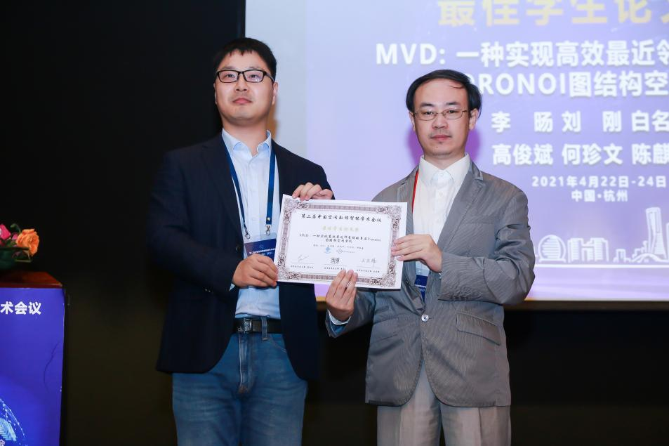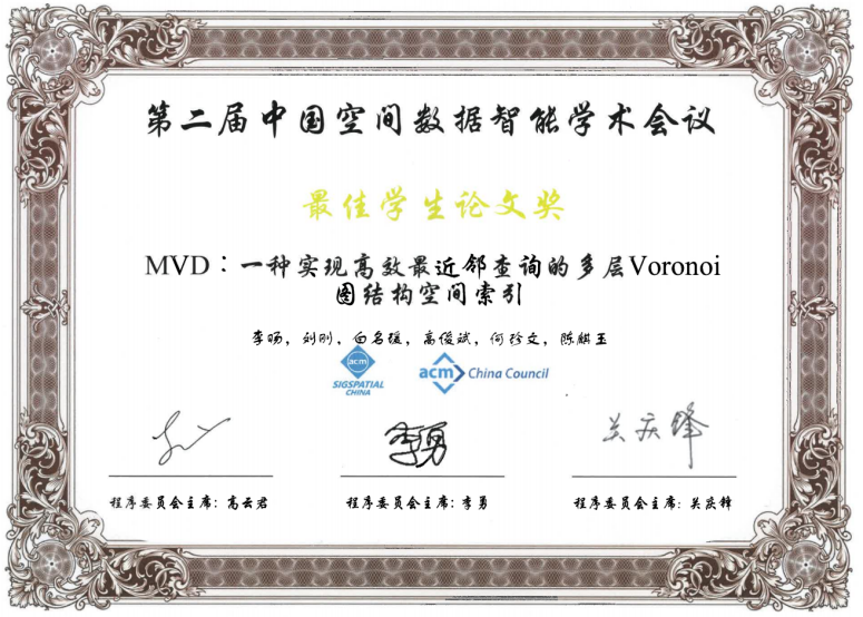 2021年4月24日,为期两天的第二届中国空间数据智能成人色情 会议(SpatialDI 2021)在杭州市浙江宾馆圆满闭幕。以成人色情 博士成人色情 李旸为第一作者,以刘刚教授为通讯作者的论文《MVD:一种实现高效最近邻查询的多层Voronoi图结构空间索引》荣获会议最佳学生论文奖。该论文针对传统树形索引主要存在的结构失衡和节点重叠问题,提出了一种基于多层Voronoi图结构的空间索引方法,提升了大规模空间数据环境下最近邻查询和k近邻查询的检索效率和I/O性能。