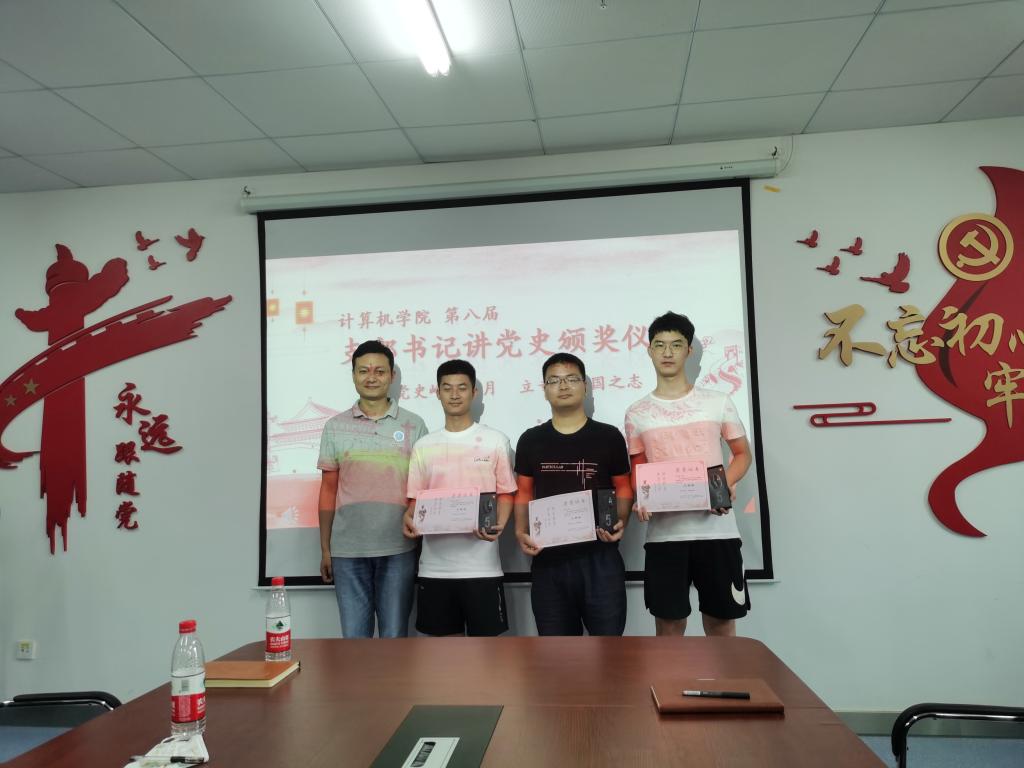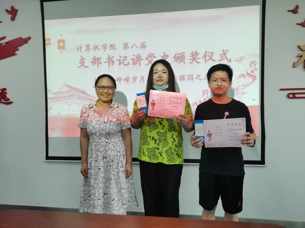 石剑峰为2018级硕士成人色情 第二党支部支部书记王开、本科生计科第二党支部王子震、博士生党支部甄慧翔颁发三等奖。