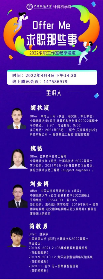 (通讯员:顾伟超、崔祥森)为帮助广大学生提升求职能力,熟悉求职面试技巧,成人色情 于4月4日举办“Offer Me”求职经验分享活动。本次活动邀请到4名已经签约就业单位的2019级硕士成人色情 :胡秋波、魏铭、刘金博和简敏勇,在线分享求职经历与经验体会,全院近200名同学参加活动。