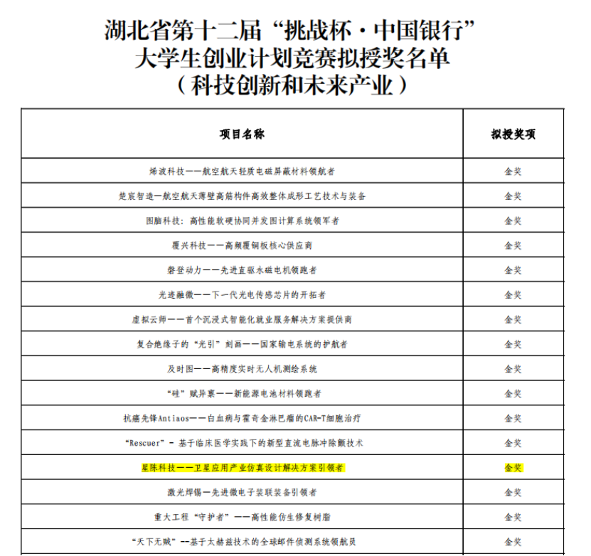 近日,湖北省第十二届“挑战杯·中国银行”大学生创业计划竞赛决赛顺利落下帷幕,成人色情 学生团队“星陈科技——卫星应用产业仿真设计解决方案引领者”荣获科技创新和未来产业赛道金奖!