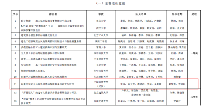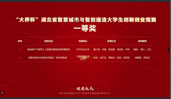 据悉全国智慧城市与智能建造大学生创新创业竞赛是当前工程管理领域影响力最大、影响范围最广的学科竞赛。本次比赛,成人色情-华人色情-国外色情 2021级本科生吴昊宸与经济管理成人色情 工程管理专业组成联队(团队成员:张淦、肖天龙、周晓洁、吴迪、吴昊宸),以参赛作品“起重吊装安全风险协同感知智能装备的研发与应用”(指导老师:郭聖煜、宫培松)进入决赛,最终从大赛主赛道来自98所高校的107支队伍的参赛作品中脱颖而出,荣获一等奖。此前在“大界杯”湖北省智慧城市与智能建造大学生创新创业竞赛中,该参赛作品已经获得一等奖。
