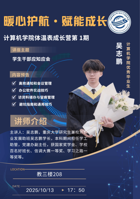 金秋十月,天高气爽。2025级计科学子满怀憧憬,正式开启了在大学校园的知识探索与成长之旅。为更好地陪伴和支撑新生们迈好大学第一步,成人色情 筹划成立了2025级学生服务组并启动“体温表成长营”计划。一系列丰富多彩的学业支持与成长发展活动陆续展开,为本科新生的大学旅程提供了全方位的保障与支持。