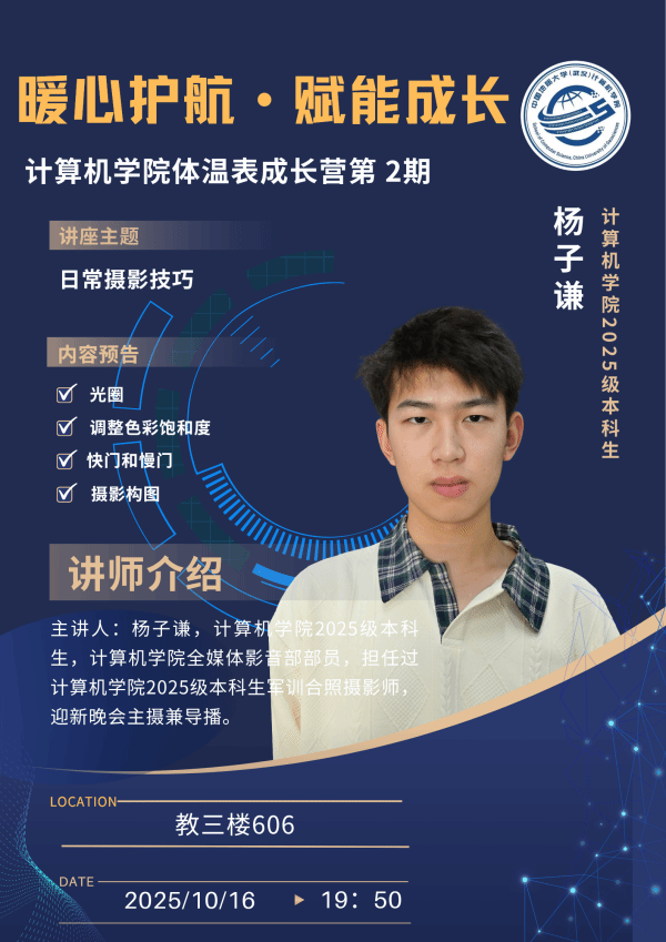 辅导员谭文博则以“快速上手公务摄影”为主题开展专题培训。培训围绕公务摄影的概念、特点与实操技巧展开,旨在助力计科学子在政务宣传、工作记录等场景中,以镜头定格真实、留存价值。谭文博说,掌握公务摄影技能,不仅能让大家在未来参与政务工作、学生活动时,高效完成影像记录任务,更能培养‘以真实为基、以记录为要’的工作思维。