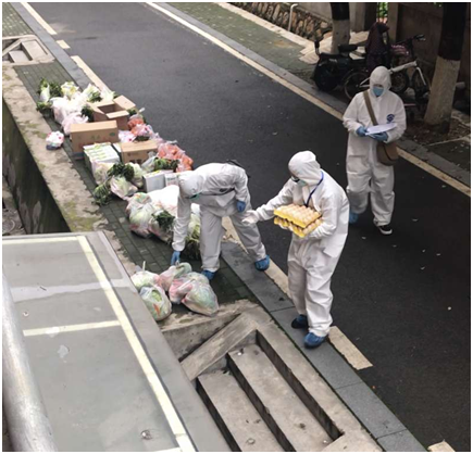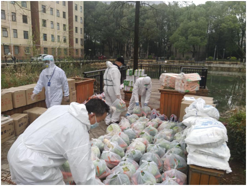 采购好的粮食蔬菜准备分发给住户