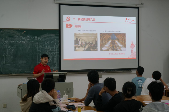 他首先带领大家观看了习近平总书记当初在陕北梁家河插队时怎样过跳蚤关、饮食关、生活关、劳动关、思想关的采访视频,引发了刚经历野外实践同学们的共鸣。他指出大家当前也面临“五关”,影响着大家的进步和发展,即游戏关、基层关、捷径关、高薪关、挫折关,希望大家向总书记看齐,克服干扰、排除万难,完成好各项学习任务。