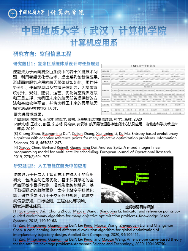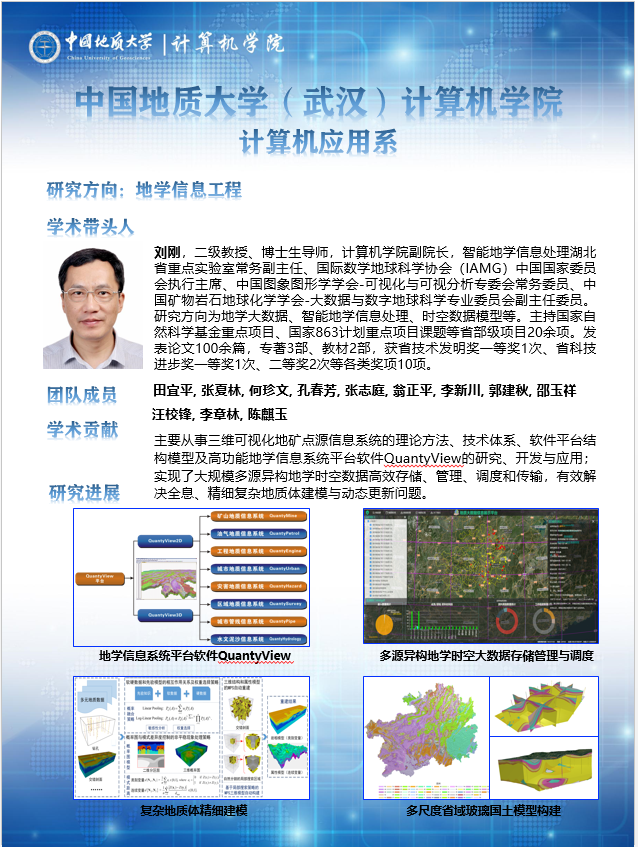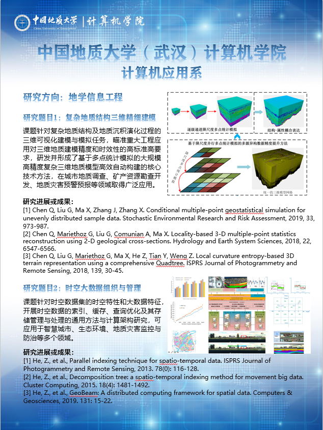 主要开展三维可视化地矿点源信息系统的理论方法、技术体系、高功能地学信息系统平台软件研究、开发与应用,复杂空间信息网络的体系设计、任务规划和推演评估、空间综合信息传输网络的设计与优化,以及遥感影像智能解译等方面的成人色情 工作。在复杂地质结构三维精细建模、时空大数据组织与管理、复杂巨系统体系设计与任务规划、人工智能在航天中的应用、地质信息技术和航天工具基础软件研发等方面形成特色方向。共有专任教师21人,其中成人色情 带头人2人,成人色情 骨干6人;近3年共承担国家和省部级等各类成人色情 项目57项,发表成人色情 论文113篇,出版专著4部,获得省部级以上奖励9项、国家发明专利和软件著作权20项。