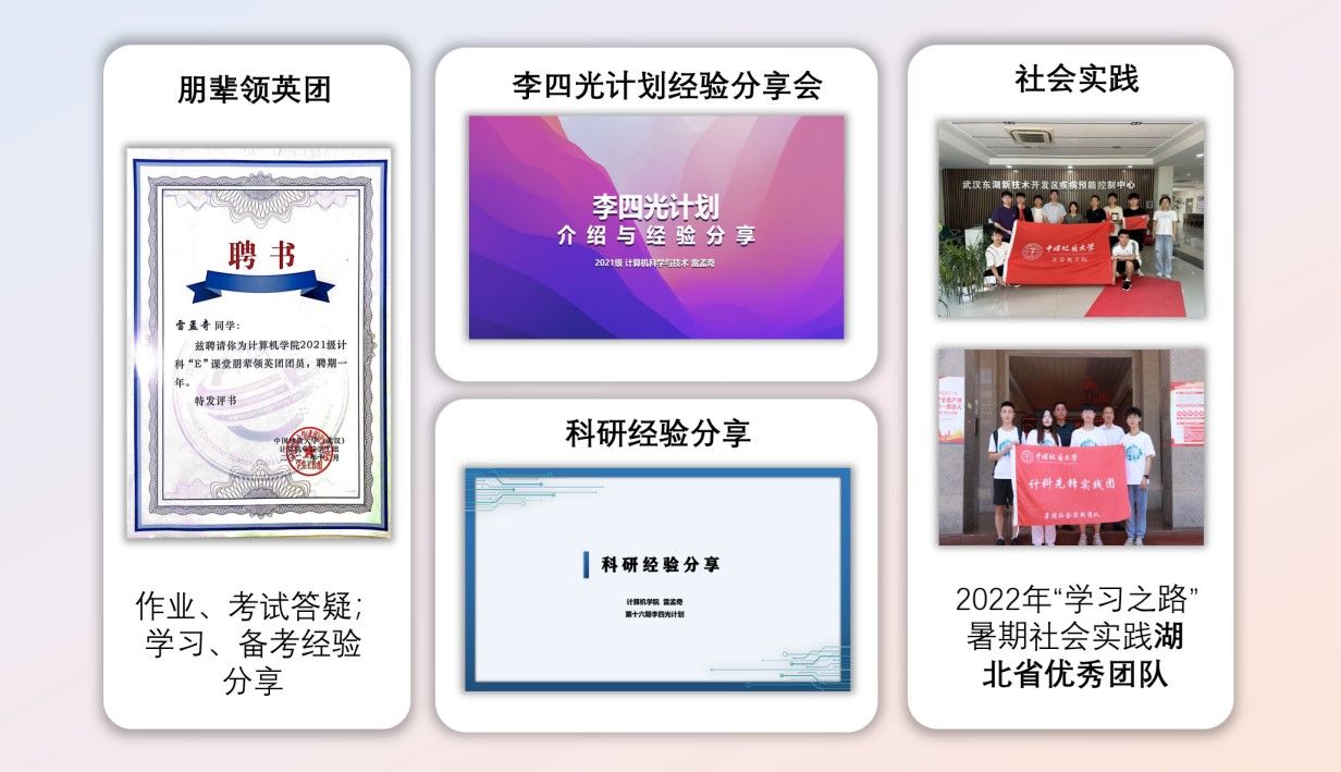 在课余生活中,雷孟奇也在服务中诠释着自身的价值。在大一刚入学时,一位优秀的学长就曾对他说,一定要发扬“传帮带”的精神。他深受触动,一直以来,他都把自己置身在群众中,用自己的力量带动大家共同进步。大一期间,他入选“朋辈领英团”,为同学们解答学习中的困难;大二时,他为22级的同学们开展了李四光计划经验分享会;大三时,他为下一级的李四光计划的学弟学妹们分享了成人色情 经验;近期,他还给22级的同学们做了数据挖掘竞赛的赛前培训。除此之外,他两次参加了暑期社会实践,雷孟奇所在的队伍获得了湖北省优秀团队。