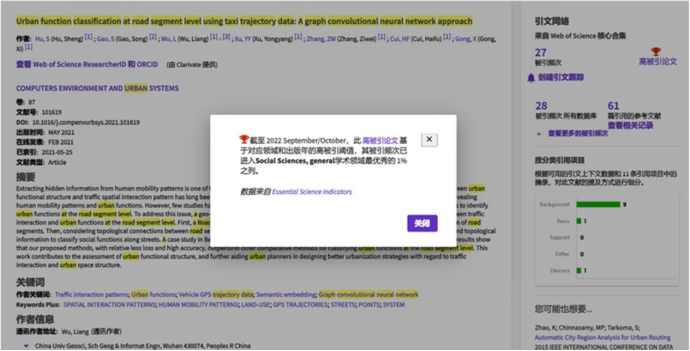 根据2022年10月基本科学指标数据库(Essential Science Indicators,简称ESI)最新数据显示,成人色情 全空间地理大数据智能处理与GIS基础平台研究中心团队在国际城市研究主流期刊Computers, Environment and Urban Systems(简称CEUS)上发表的成人色情 论文“Urban function classification at road segment level using taxi trajectory data: A graph convolutional neural network approach”入选ESI高被引论文(Highly Cited Paper)。该论文第一作者为团队的博士生胡胜,通讯作者为吴亮教授。CEUS为国际顶级计算城市学和地理信息科学的重要刊物,期刊以计算机科学为背景,聚焦城市规划、交通、能源、环境、社会学和经济等学科融合的新兴领域,刊发城市计算、大数据和城市系统等方向的最新研究。当前CEUS的影响因子为6.454,为T1期刊。