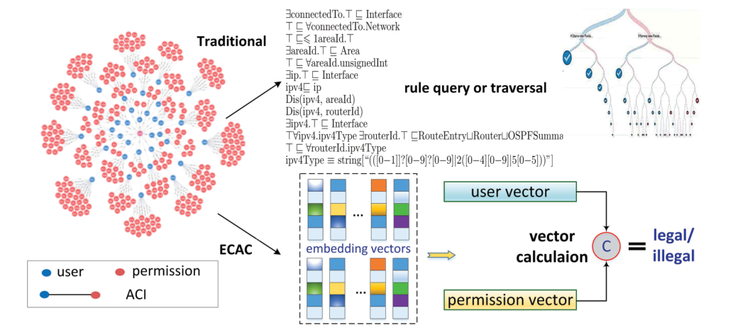 该论文针对网络安全控制中的技术瓶颈问题,研究基于知识嵌入的安全控制办法。访问控制是网络空间安全的基础理论和基础技术。在传统的网络环境中,防火墙、入侵防范系统等安全部件,基于事先制定的安全策略和规则,实施访问控制,保护网络的安全。然而,在大数据时代,网络空间实际处于一个极其开放的环境中,仅仅依靠传统的静态安全技术,难以对层出不穷的恶意代码、攻击流量进行有效的防范。针对这一问题,本文借鉴人工智能中的知识嵌入思想,将存量安全规则、日志信息、恶意代码特征等,视为计算机的“先验安全知识”,将其表示为欧几里得空间中的向量,用向量计算的方式实现安全知识的推理、预测;从而赋予计算机“理解安全知识,并利用已有知识对网络安全环境进行预判”的能力,助力实现智能化的网络安全访问控制。
