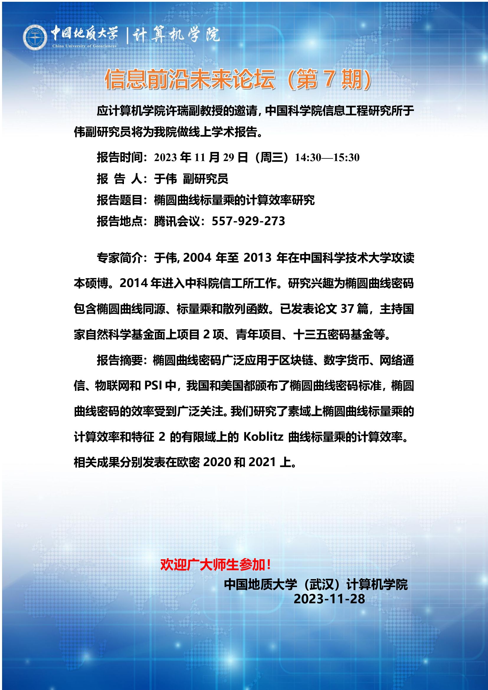 信息前沿未来论坛(第7期):中国科成人色情 信息工程研究所于伟副教授——椭圆曲线标量乘的计算效率研究
